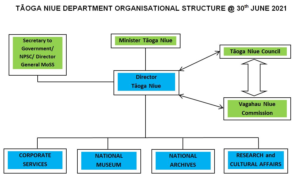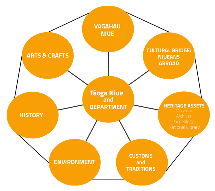 Tāoga Niue Department is the coordinating, facilitating and monitoring arm of Tāoga Niue and established under the Tāoga Niue Act 2012 and the central coordinator of all matters relating to tāoga Niue. It is also the Secretariat for Vagahau Niue Commission and Tāoga Niue Council and responsible for administering the Archives Act 1992 and the Vagahau Niue Act 2012. The Department also manages the daily operations of the Niue National Archives and the Niue National Museum and is committed to the effective implementation of its core functions and most importantly be a competent body to